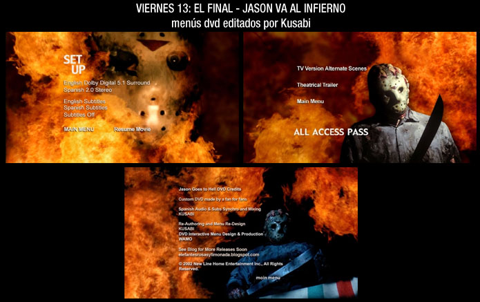 | Después de casi dos semanas de duro trabajo (me volví loco para conseguir la sincronización) os traigo mi primer montaje en DVD. Está hecho a partir de la versión en NTSC, añadiendo el audio y los subtítulos en castellano (subtítulos también creados por mi). Los extras no tienen subtítulos en ningún idioma. El DVD original incluía tanto la versión Rated como la Unrated, yo sólo he mantenido la segunda, y como al audio en castellano le faltan las partes censuradas, esas partes aparecen con el audio original en la versión en castellano, pero como la mayoría son escenas sin diálogo o con mínimas frases sin importancia no creí conveniente hacer subtítulos forzados (quien quiera saber que es lo que se dice siempre puede poner los subs españoles completos). El audio castellano está extraído de un DivX que hay por la red (con montaje distinto a éste DVD) y que no tiene mucha calidad, así que no esperéis mucho del audio español... En cuanto a los menús los he adaptado a ésta versión, añadiendo los datos correspondientes al audio y subtítulos, todo en inglés para poder mantener así los menús animados (lo del Jason en la selección de escenas también es cosa mía, me hacía gracia...). Arriba tenéis una captura de los menús que he editado. Otra cosa más: de los extras he quitado un par de cosas, el comentario en audio (ya que el DVD que bajé tampoco lo tenía) y el salto a cada muerte (que simplemente era un menú en el que iba directamente a cada muerte que se ve en la película, me lo ahorré para evitar lios de conexiones en la re-autoría del menú). Bueno, espero que os guste mi primer montaje, y comentadme los errores para evitarlos en próximos DVDs. Salu2! | |